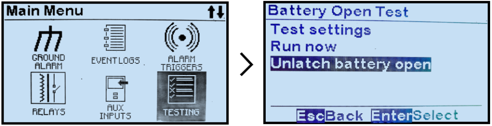 To initiate the Unlatch Battery Open Alarm control and reset the Battery Open Alarm: