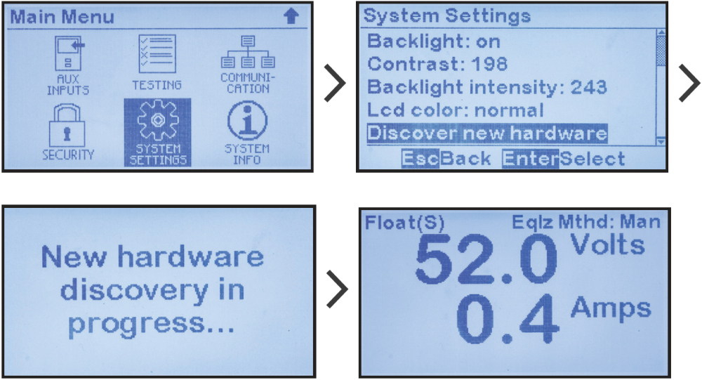MENU > SYSTEM SETTINGS > discover new hardware (MENÚ > AJUSTES DEL SISTEMA > detectar nuevo hardware)