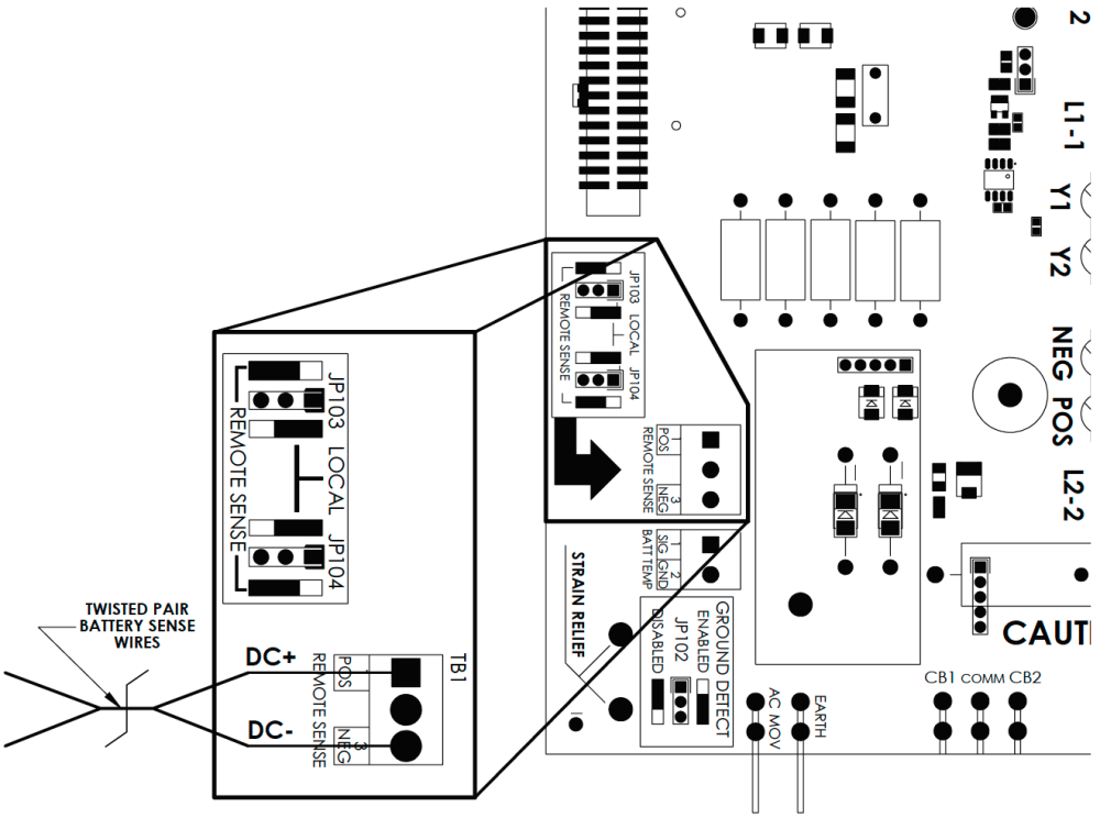 Coloque el cable de par trenzado entre la batería y el cargador del equipo ATevo, y realice las conexiones descritas abajo ANTES de mover los puentes habilitantes de la detección remota para habilitar la función de Remote Sense (detección remota).