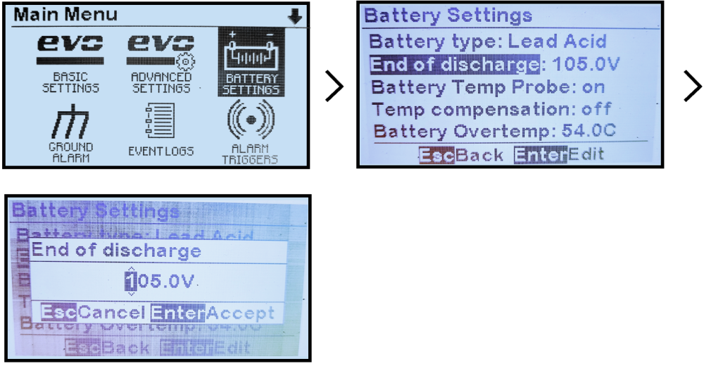 MENU > BATTERY SETTINGS > ‘End of discharge’ > select & change digit values > EDIT/ENTER to save