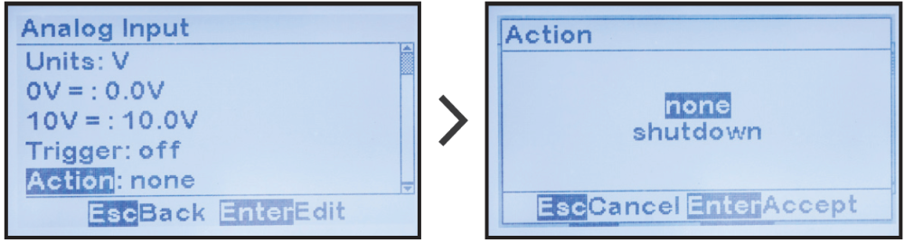 MENU > AUX INPUTS > ‘Analog Input Configuration’ (MENÚ > ENTRADAS AUX > ‘Configuración de entradas analógicas’) > seleccione la entrada (como se muestra arriba) > ‘Action:’ (Acción) > seleccione la acción