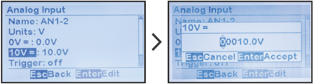 El equipo ATevo puede escalar los valores de entrada analógica, de manera que la medida se pueda representar en unidades primarias. Para ajustar el escalado, ingrese el valor primario cuando la entrada analógica esté en 0 V, y el valor primario cuando la entrada analógica sea 10.0 VCC. El equipo ATevo informará las medidas y ajustará los umbrales de alarma en unidades primarias verdaderas.