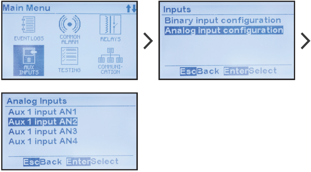 MENU > AUX INPUTS > ‘Analog Input Configuration’ (MENÚ > ENTRADAS AUX > ‘Configuración de entradas analógicas’) > seleccione la entrada > seleccione el parámetro como se muestra en las opciones desplegables a continuación.