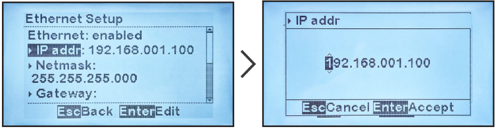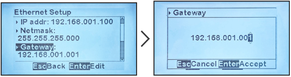 - To change the Gateway: MENU > COMMUNICATION > “Ethernet setup” (as shown in Section 10.3.1) > “Gateway:” > change digits