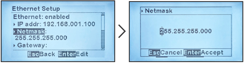 - To change the Netmask: MENU > COMMUNICATION > “Ethernet setup” (as shown in Section 10.3.1) > “Netmask:” > change digits