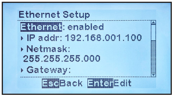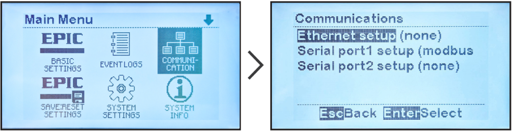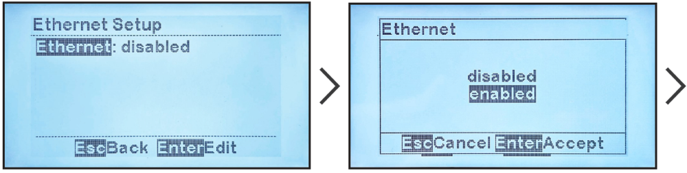 MENU > COMMUNICATION > “Ethernet setup” (as shown above) > “enabled”