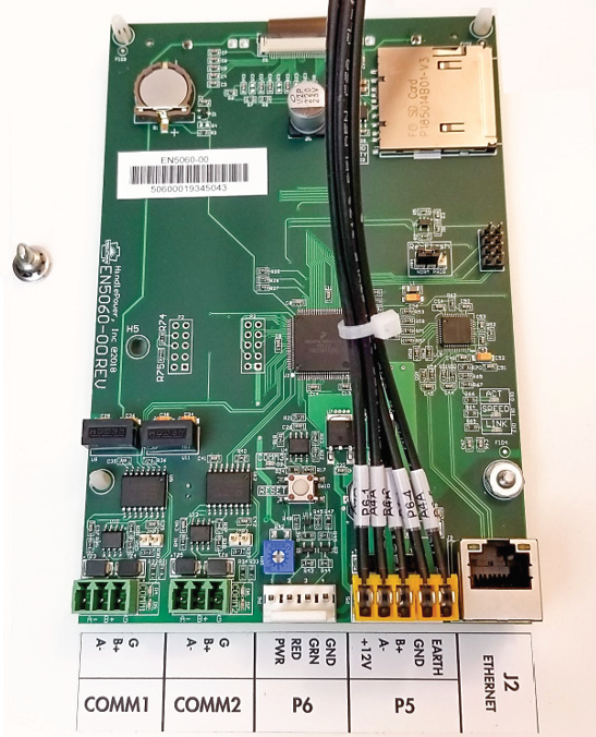 To make connections between the EPIC Controller and an RS-485 network, open the EPIC Controller display door. As seen below, two (2) RS-485 ports are located on the bottom left corner of the EN 5060-00 display board that is mounted in the EPIC Controller enclosure. Attach (A–), (B+), ground(G) to the communication port. Instructions for configuring RS-485 ports are in Section 10.2 of this manual.
