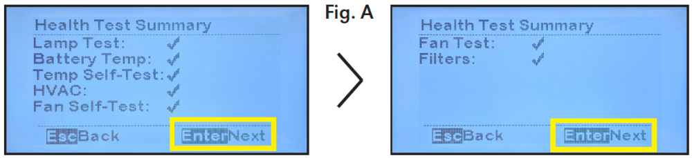 When all testing has been completed, you can view 2 screens that summarize test results. Tests that pass display a checkmark. An example where all the tests pass is shown in Fig. A below.