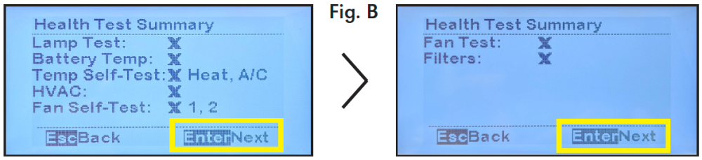 Tests that have failed display an X and specify the equipment which did not pass — heater, air conditioner, or fan (including fan number). An example of this is shown in Fig. B.