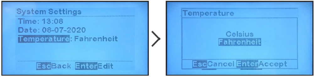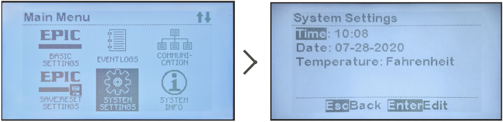 To enter System Settings mode, select MENU > SYSTEM SETTINGS. The EPIC Controller will display a page of parameters.