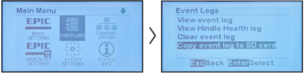 MENU > EVENT LOGS > ‘Copy event log to SD card’