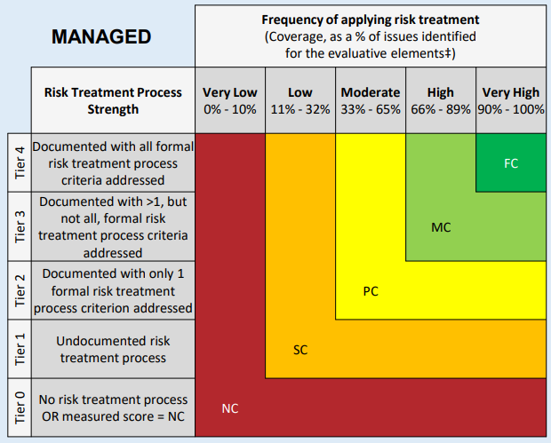 Managed: The operational measure identified one issue in the past year that was remediated (“Very High” Coverage) using the organization’s documented risk treatment process. The risk treatment process met two of the three formal risk treatment process criteria (“Tier 3” Strength). This indicates a Managed score of 75%.