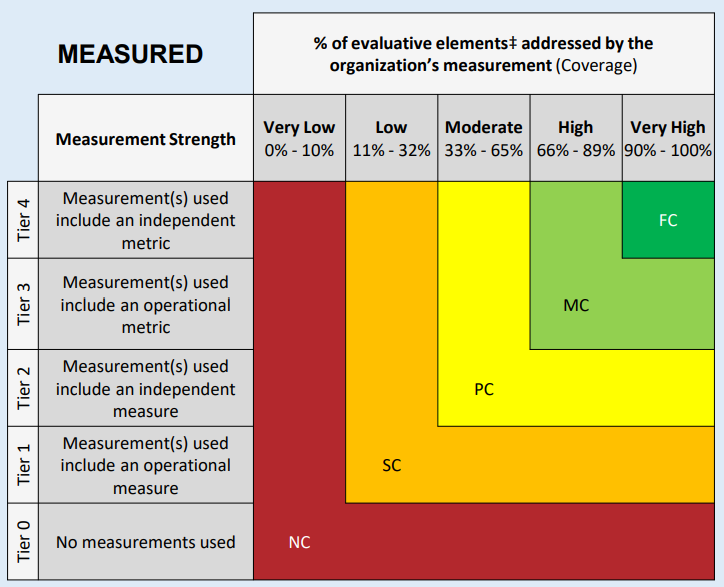Measured: For a requirement statement with four evaluative elements, the External Assessor determines that the organization has an operational measure (“Tier 1” Strength) that addresses all four evaluative elements (“Very High” Coverage). This indicates a Measured score of 25%.