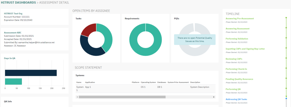 - Open items assigned to the Assessed Entity, External Assessor, and HITRUST