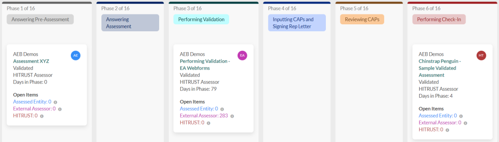 A Kanban-style board that displays HITRUST validated assessments as they traverse each phase of the validated assessment workflow. The board includes key details of each validated assessment, including: