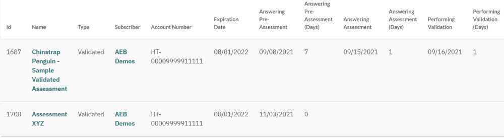 A spreadsheet-style view that displays the date that HITRUST validated assessments enter each phase of the validated assessment workflow, as well as the number of days that the assessments have been in each phase.