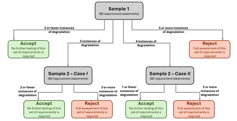 15.5.15 For each sample of 60 requirement statements, if scores are lowered for two or fewer requirement statements, the sample is accepted and no further testing of requirement statements in that set is required.