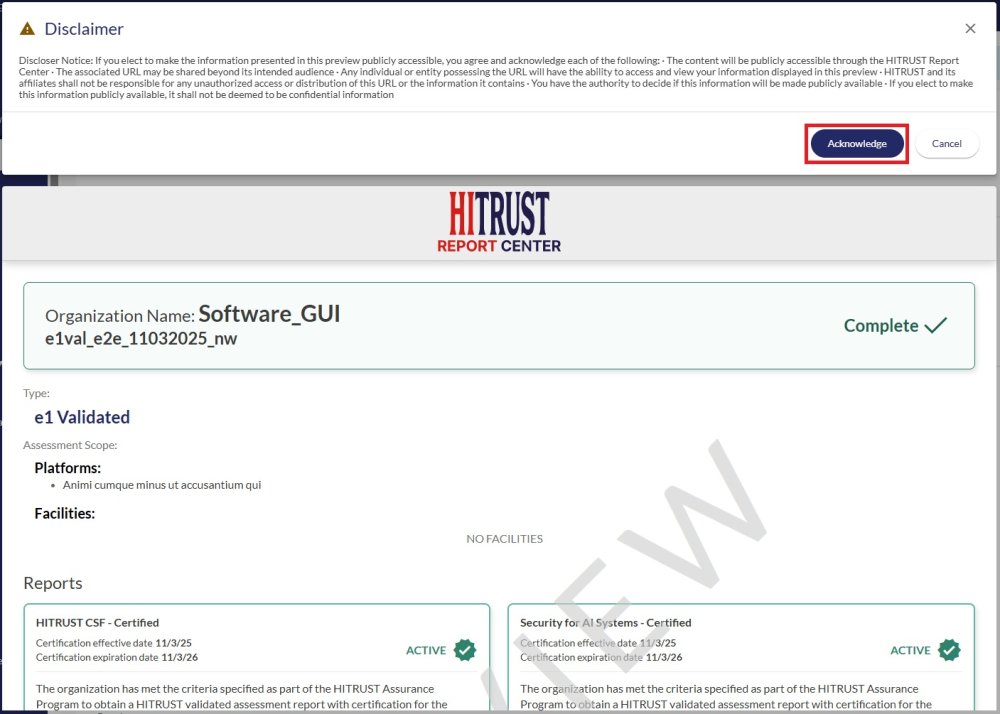 3. A disclaimer modal will appear. Click “Acknowledge” to proceed.
