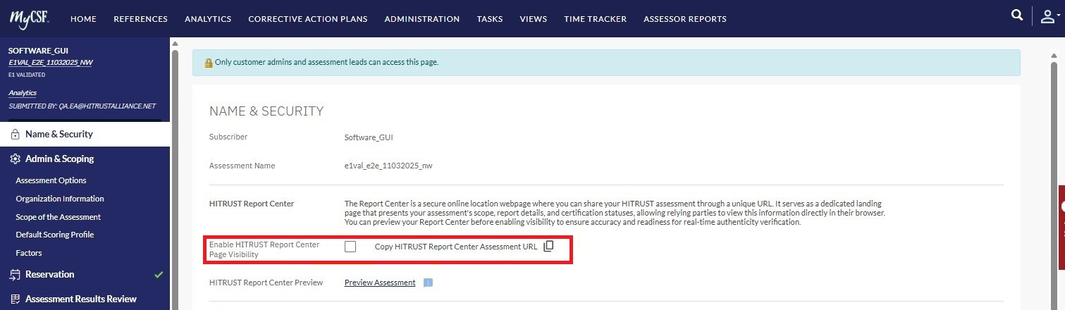 2. Select “Enable visibility of the HITRUST Report Center for this assessment.”