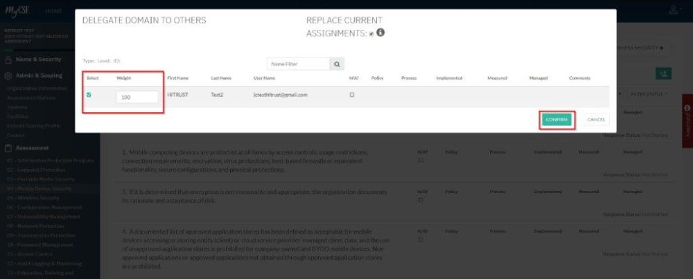- A table of users will appear to select the checkbox next to the appropriate users’ names to have them provision the Assessment Domain.