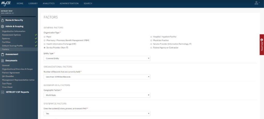 The inputs on the Factors tab are used to measure the risk inherent to your environment. The information provided within will be used to narrow down the list of assessment statements for your questionnaire.