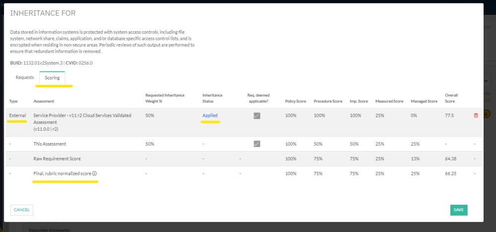 2. Within the Inheritance Modal, click on the ‘Scoring’ tab. The first line shows the external assessment from which the scores were inherited. Note the Inheritance Status column indicates “Applied” in blue text to confirm the scores were successfully inherited. The last line “Final, rubric normalized score” displays the final scores for each maturity level. Click Save to exit out of the Inheritance Modal.