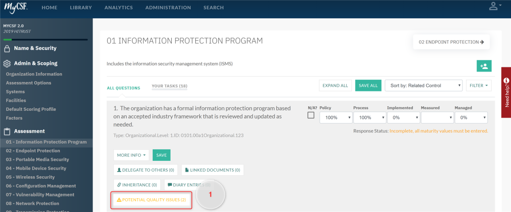 There are two ways within MyCSF to view the Potential Quality Issues raised within your Assessment. The first manner is observing them on a Statement while inside an Assessment Domain. The second option is to view all of the Potential Quality Issues in a consolidated list.