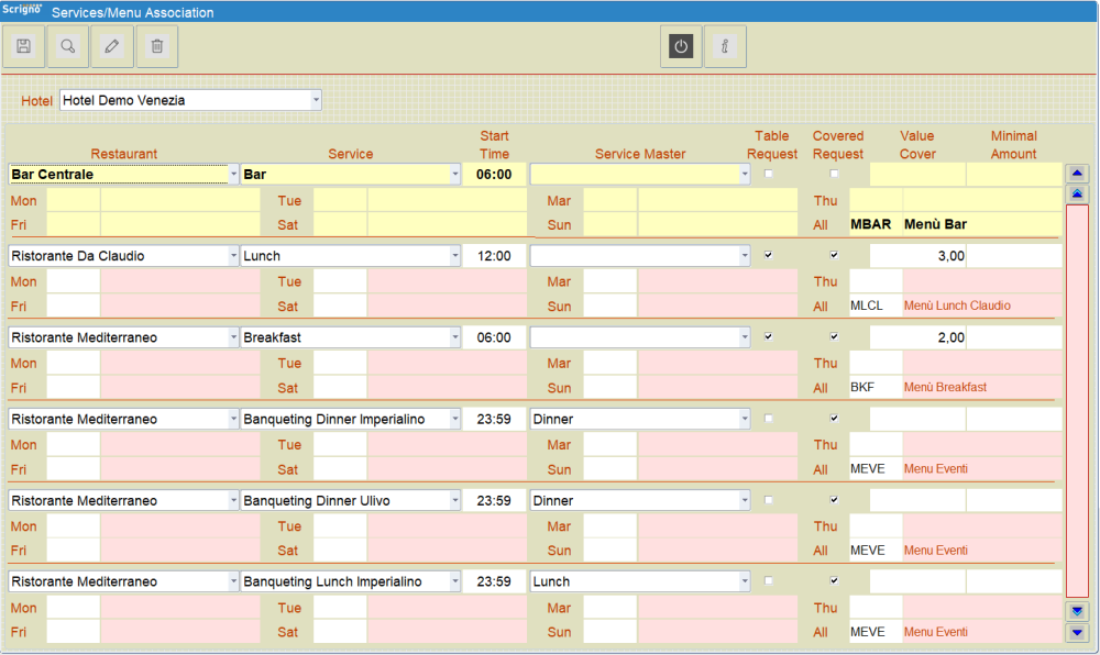With the mask of fig. 46 it is possible to associate menus with various services by defining the service start time and days of coverage.
