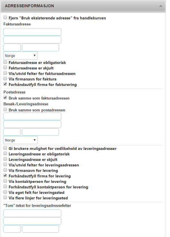 Adresseinformasjon inneholder adressene til firma. I tillegg til adressene til firma styrer adresseinformasjon mange valg angående handlekurven bla. obligatoriske felt, synlighet osv.