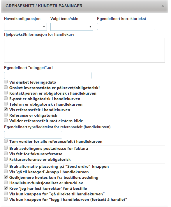 Grensesnitt / Kundetilpassinger styrer instillinger i forbindelse med konfigurasjon, skin, egendefinert korekturtekst, prisbetingleser, oppstartsgebyr, rabatt og tilpassinger i handlekurven for kunden.