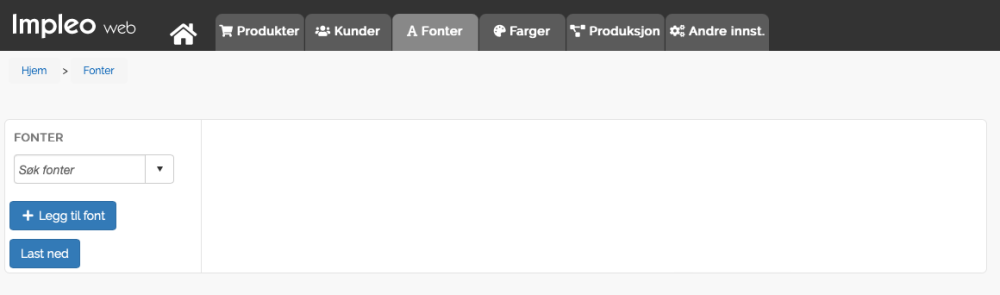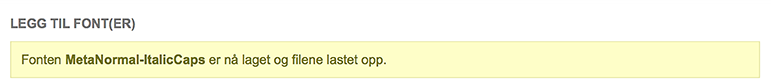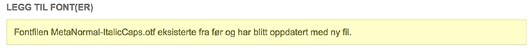 Når fonten er lastet opp vises en beskjed om hvilke fonter som er lastet opp til Impleo Web. Impleo Web henter automatisk ut fontnavnet fra filene som lastes opp.