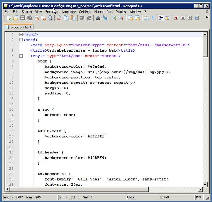 Oppbyggingen av html filen kan ikke gjøres i Impleo Web, det må gjøres i en egnet html editor. En html fil kan lages og editeres i en hvilken som helst teksteditor. Hvis man velger en editor som er beregnet på å skrive html koder så vil koden bli lettere å lese. Bildet under viser koden i ”Notepad ++”
