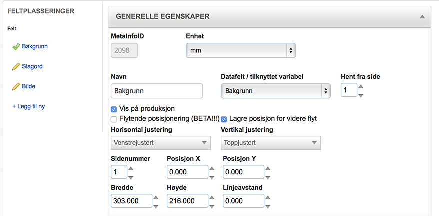 Felt for registrering av plasseringens x-verdi. Impleoweb beregner plasseringer ut i fra top venstre på malproduktets produksjonsfil. Hvis en produksjonsfil inneholder bleed, skjæremerker o.l. må man ta hensyn til dette for plasseringes x-verdi.