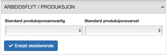 Ved å klikke på “Erstatt eksisterende” knappen vil eksisterende produksjonsansvarlig og produksjonsvarsel på alle produktene i kategorien erstattes med det som er valgt i “Produksjonsansvarlig” og “Produksjonsvarsel”
