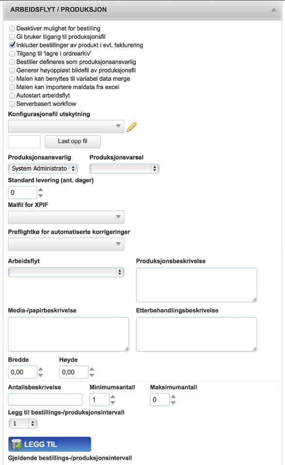 Arbeidsflyt / Produksjon seksjonen inneholder alle innstillingene og valgene for den arbeidsflyten et produkt skal ha og de produksjonsinnstillingene som skal være på et produkt.