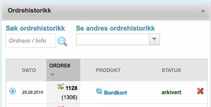 Lagre i ordrearkiv lagrer ordren på samme måte som om den hadde vært bestilt. Bruker vil finne igjen ordren i ”Ordrehistorikk” på ”Min profil” siden. Brukeren kan derfra aktivere bestillingen, eller hente opp ordren å gjøre de endringer som trengs.