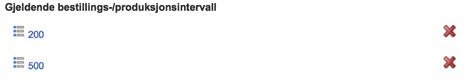 Viser en liste over de bestillings-/produksjonsintervallene som er koblet mot produktet. For å slette en kobling mot et bestillings-/produksjonsintervall klikker man på ”x” til høyre for bestillings-/produksjonsintervallet.