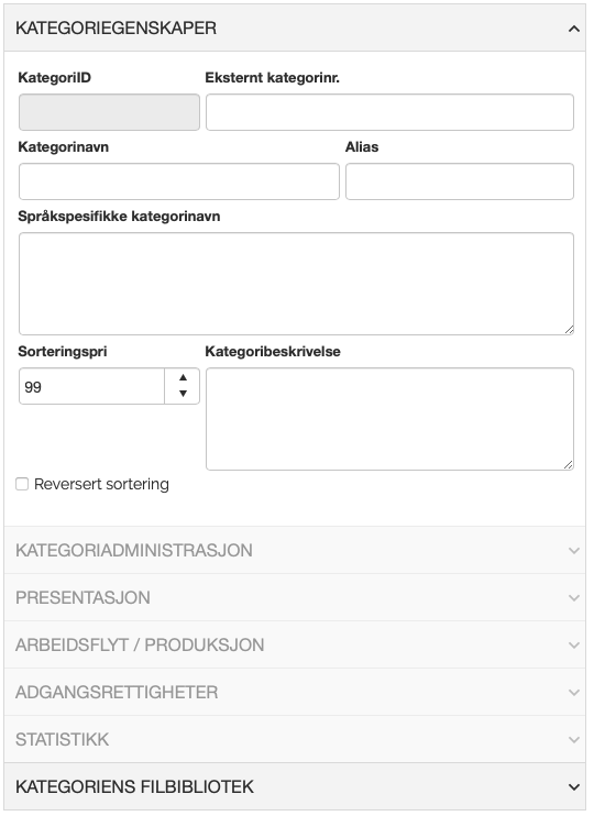 Felt for registrering av kategoriens sorteringsprioritet. Standard verdi på dette feltet er 99.