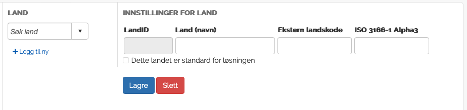 Det er mulig å legge til land i løsningen, og velge hvilket land som skal være standard i løsningen, dvs at det landet er forhåndsvalgt i løsningen når det skal registreres en adresse.