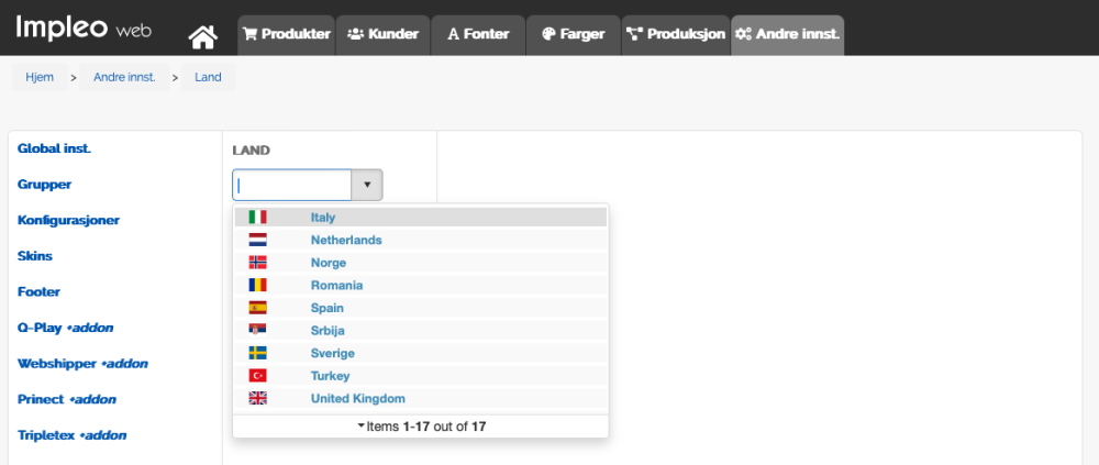 Land inneholder en oversikt over de landene som er registrert i Impleo Web. De landene som er registrert her brukes i adresser.