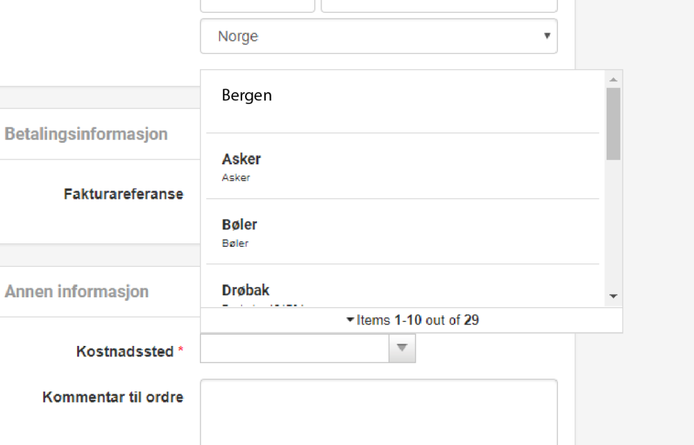 Brukeren vil da kunne bestille produkter for kunde 2 og sende produktene til korrekt sted, samt faktura. (Grunnen til at vi lager to firmaer er fordi firma 1 ikke skal se nedtrekksmenyen for faktura/kostnadssted i handlekurven)