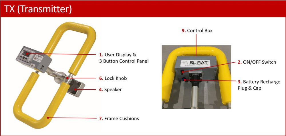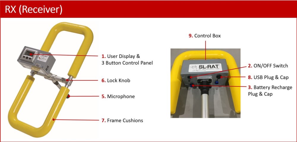 The SL-RAT® device is composed of two parts. The transmitter (TX) component is identifiable by its bulkier speaker housing containing a heavy-duty marine-grade speaker, and its heavier weight (see Figure 1). The receiver (RX) is identifiable by its smaller sensor housing containing a high-quality microphone, and its lighter weight. Each component is also labeled with a “TX” or “RX”.