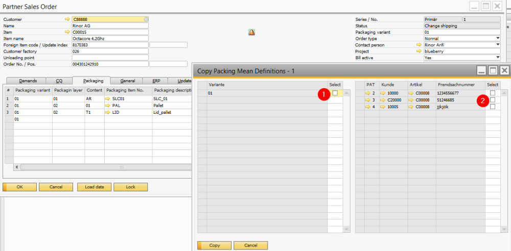 First select the packaging definition that should be copied (1). There is always just up to one definition to select (no selection if no packaging definition is available!). It is the definition of the partner sales order from which the “copy window” was opened from. As the next step select the partner sales order to which the definition is copied to (2). More than one selections are possible.