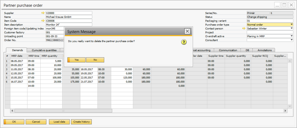 The feature “Remove” allows the deletion of a partner purchase order. A confirmation message appears before the definite removal: