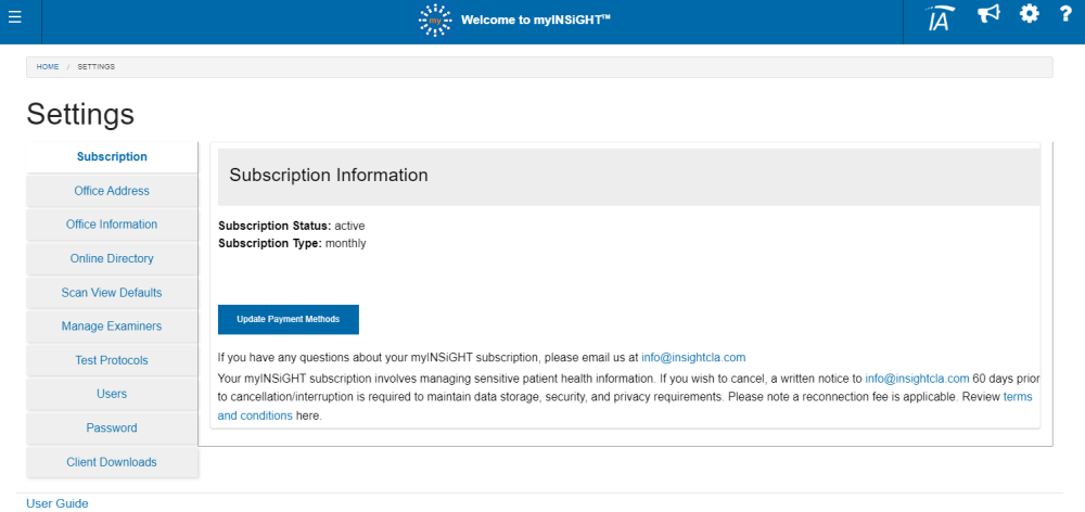 To open the web portal settings page, go to the doctor portal (www.portal.subluxation.com), which can be accessed by either of the following quick links, Manage Patients or View Patient Scans and Reports. Once on the doctor portal, click the gear icon in the top left menu bar of the website and the Settings Menu will open.