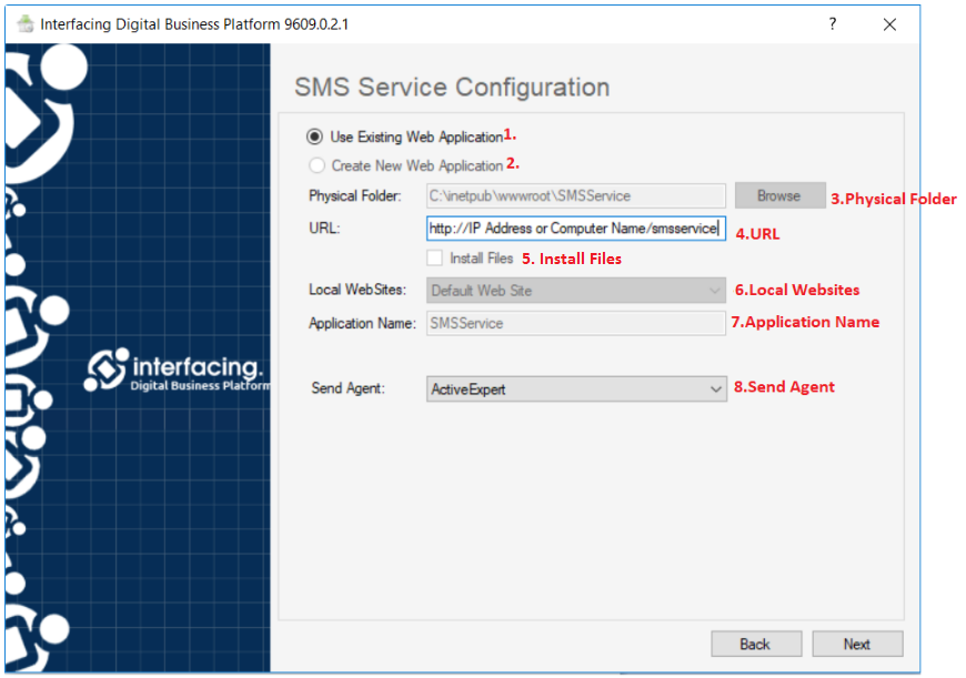 By choosing this option, the installation is performed on the existing SMS Service available on the system.