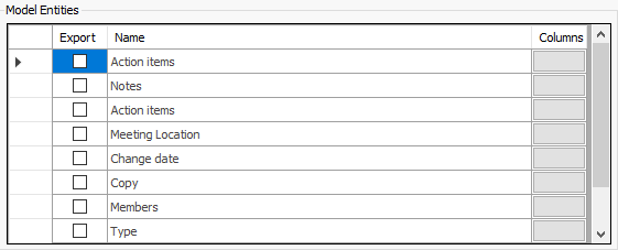 The list of selected application entities is displayed within this box. Each application can be selected by clicking the “Export” option.