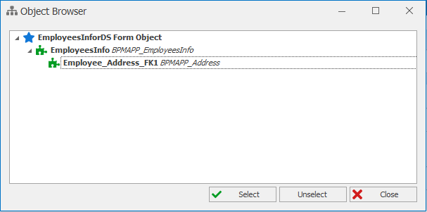 By selecting the button , the “object selector” that contains the attributes defined in the entity is displayed.