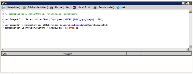 To define the image call code, first define an action (See 8.2) and then edit it in the code environment and insert and save the image call code as shown below: