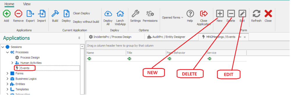 2. Select the transition/connector (See 6.1.1.2) (←) between the two activities in the Process Diagram section (See 6.1), and then edit, create and delete events in the event dialog.
